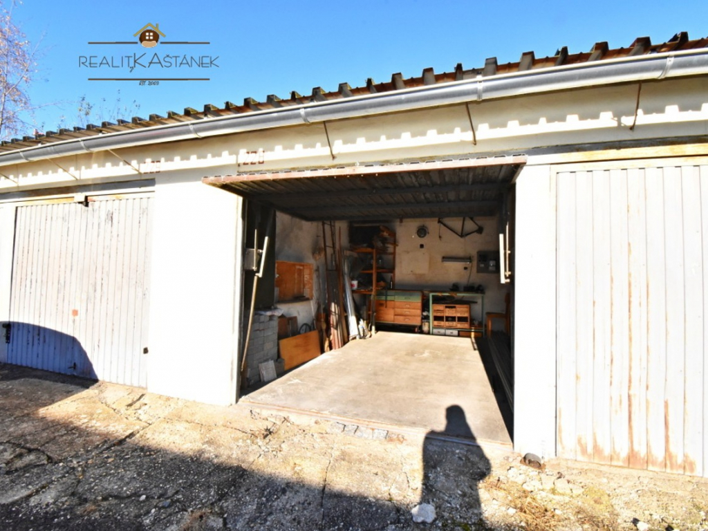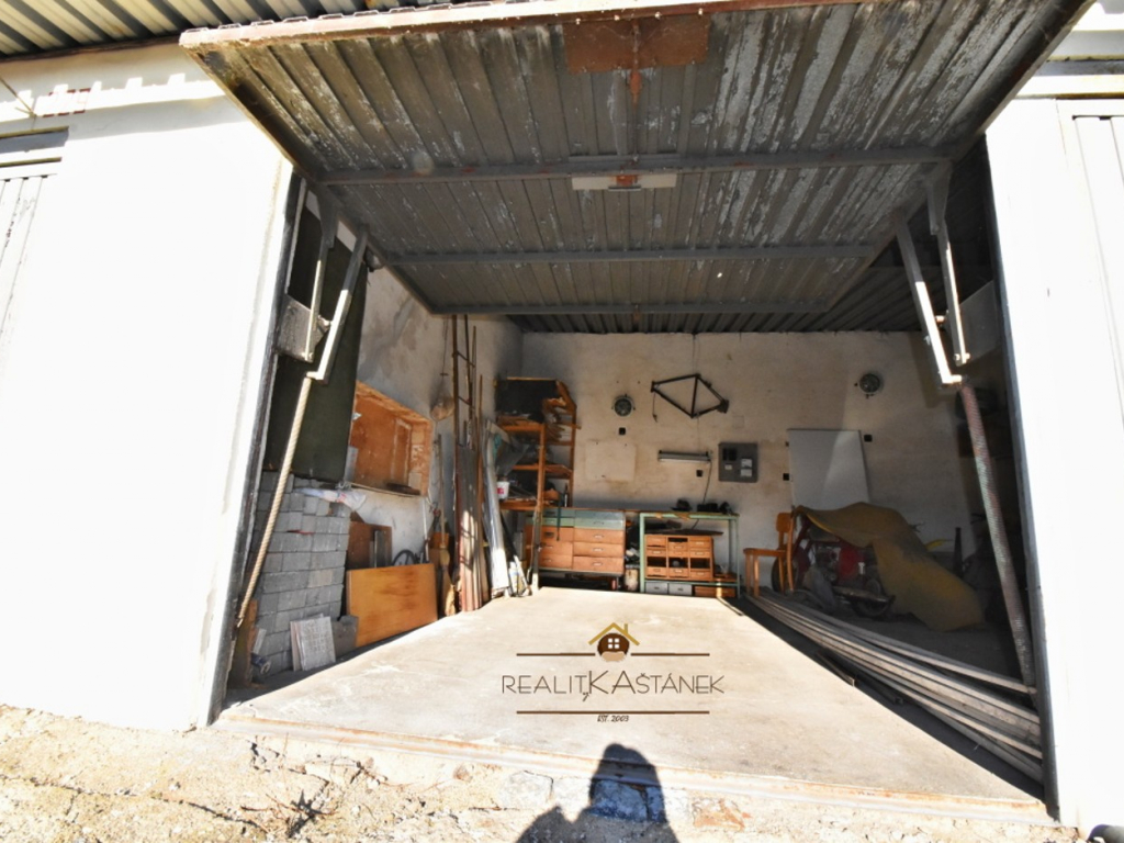 Zděná řadová garáž, plechová vyklápěcí vrata, manuální zamykání, podlaha – betonová stěrka, el. zavedana – 220 V, nová střecha z vlnitého plechu, štěrková příjezdová cesta.