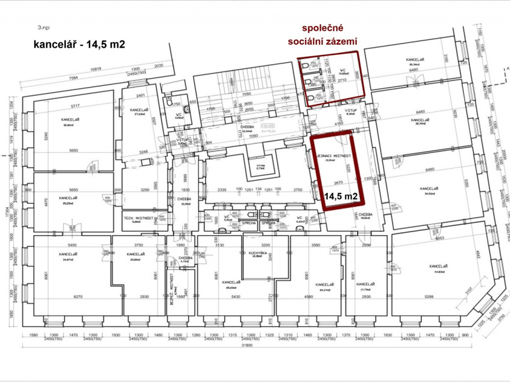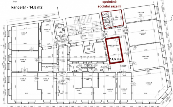 14,5 m2 | 1 kancelář + sociální zázemí + společná kuchyňka | 3. NP | výtah | parkovací stání