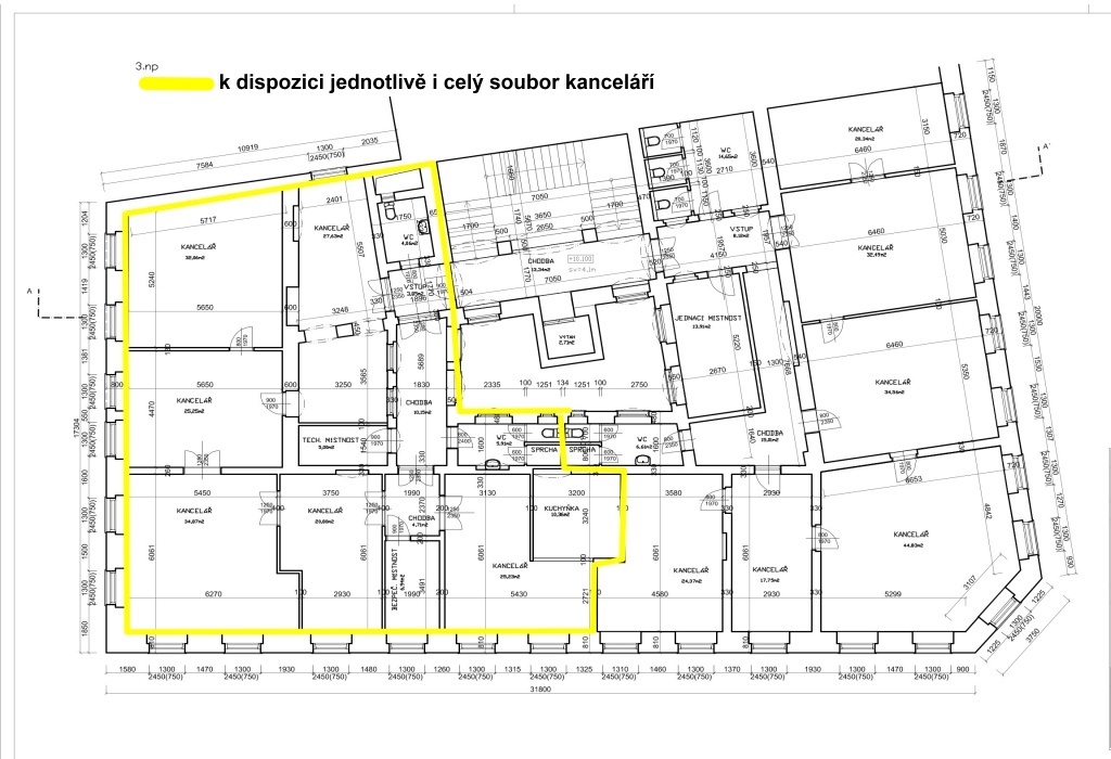 K pronájmu možno jednotlivé kancelářské jednotky (cca 25 m2 či celý soubor kanceláří, tj. 1/4 patra budovy – cca 170 m2)